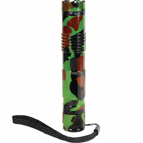 The Safety Technology Camouflage BashLite 15,000,000 volt Stun Gun Flashlight has a sleek durable design. It is made from high quality aircraft grade aluminum. The BashLite will strike with 4.7 milliamps of stun power. The knockout punch of the stun gun will take an attacker down very quickly leaving them in pain and on the ground. The super bright 120 lumen light can be used tactically and shined in the eyes of an attacker to temporarily blind them. It comes with a wrist strap lanyard and has an on/off safety switch. The sleek design is perfect so it can fit easily in a pocket, side door of a car, or in your hand ready to strike. It measures 5 13/16″ x 1″, comes with a wall charging cord and nylon holster.