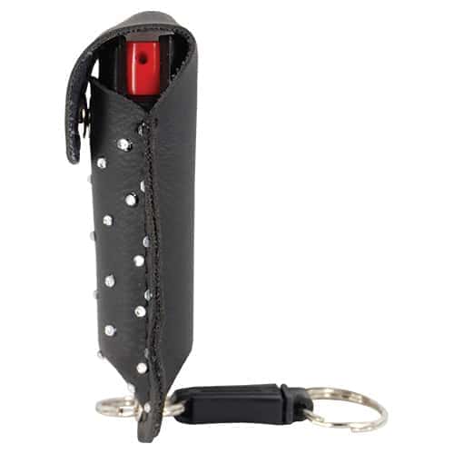 Pepper Shot 1.2% MC ½ oz rhinestone leatherette holster black. Pepper Shot Pepper Spray is made with 1.2% Major Capsaicinoids. The Major Capsaicinoids are the true heat measure and Pepper Shot 1.2% MC is more effective than of most other pepper sprays. In addition to causing an attacker pain, The Pepper Shot 8.5% oleoresin capsicum formula swells the mucous membranes, which makes breathing difficult, and swells the veins in the eyes, causing the eyes to close. It’s made from 2,000,000 SHU’s of raw pepper and these effects can last up to 45 minutes and cause no permanent damage. Has a UV identifying dye to help aid in the identification of an attacker. 1/2 oz with rhinestone leatherette holster, locking actuator and quick key release key chain. Effective up to 6-8 feet. Contains 6-10 one second bursts. 4 ¼” x 1 ½”